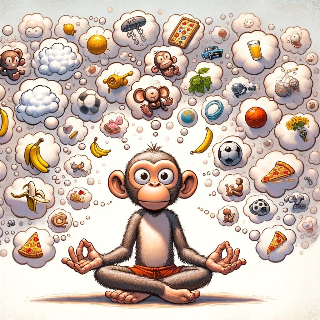 Most beginning meditators experience “Monkey Mind,” the awareness of the cacophony of thoughts ordinarily relegated to the subconscious mind. Without mental disipline and concentration, attention will drift from one thought to another, generally following the path of highest emotional charge. This is also why pain body episodes are so distracting.